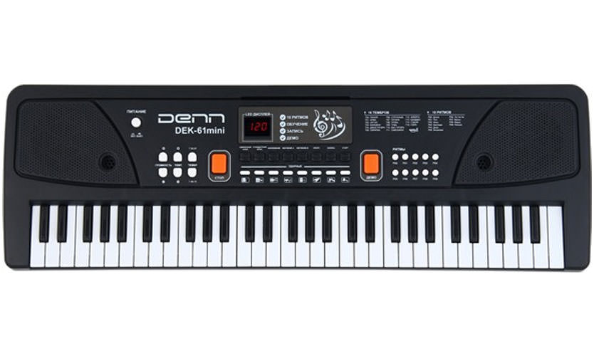Le meilleur modèle dans le classement des synthétiseurs pour enfants. Équipé de 44 clés passives non pondérées. Avec une acoustique moins puissante (seulement 1,6 W), le DENN DEK61mini sonne mieux. Les possibilités sont étendues - 100 voix, 50 styles d'accompagnement. Il est plus facile de gérer cela grâce à l'écran intégré affichant tous les paramètres actifs. Prix - 5890 roubles.