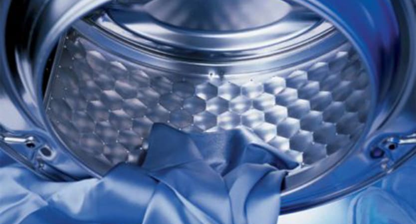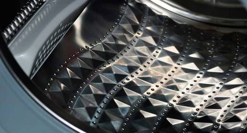 Les trous dans les tambours en nid d'abeilles sont si petits qu'il est impossible d'y resserrer le tissu. De plus, la combinaison des parties convexes et concaves du tambour crée un mince film d'eau sur la surface, qui empêche les fibres de tissu de frotter contre le métal du réservoir de chargement.