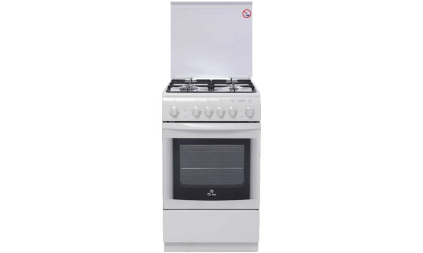 Poêle (50x60x85 cm) pour 4 brûleurs (un grand). Dispose d'un four rétro-éclairé d'une capacité de 54 litres. Il y a un gril et une broche inclus. Prévu pour l'arrêt du gaz en l'absence de feu dans le four. L'allumage électrique est destiné uniquement aux zones de cuisson. Il y a une minuterie.