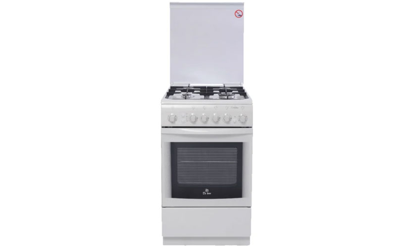 Le poêle (50x50x85 cm) avec les mêmes interrupteurs dispose de 4 brûleurs (un chauffage rapide). Capacité du four 43 litres. Il y a un contre-jour. Équipé d'un gril et d'une brochette. Les brûleurs et le four sont protégés contre les fuites de gaz. Il y a un allumage électrique mécanique de la plaque de cuisson. Il y a une minuterie sonore.