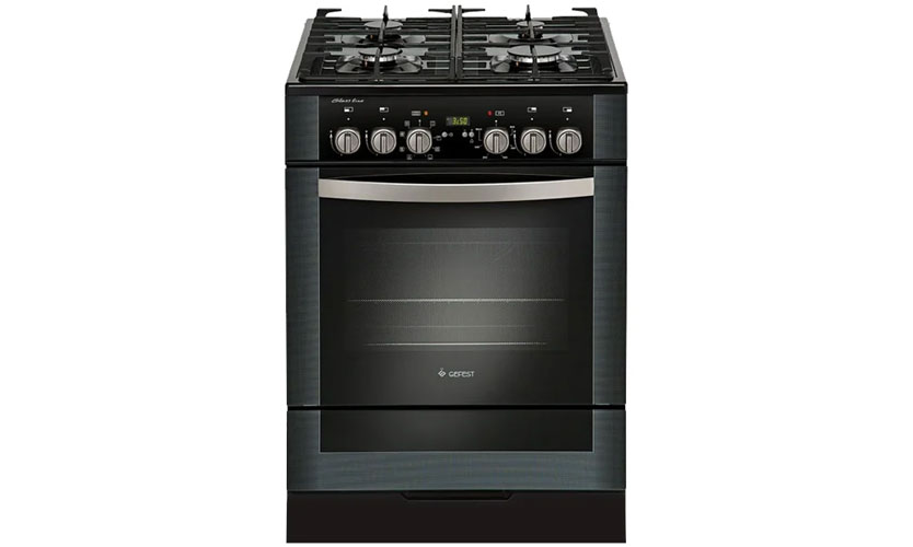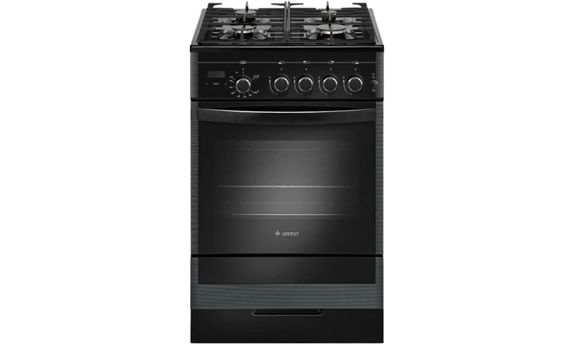 Poêle noir (60x60x85 cm) avec quatre brûleurs à gaz et un four électrique d'une capacité de 52 litres. Couvercle en verre trempé. Grilles en fonte. A un gril et une broche. Ci-dessous se trouve un tiroir pour placer des casseroles et des casseroles. Commande de commutation. Il y a un écran et une horloge sur le boîtier. Il y a une minuterie, l'auto-allumage et une protection contre les travaux sans incendie.
