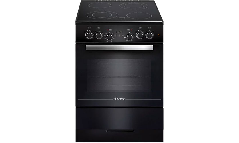 Poêle (60x60x85 cm) avec revêtement en vitrocéramique noire. Dispose de 4 brûleurs électriques (deux à double circuit). Le four électrique de 52 L dispose d'un gril et de la convection. Il y a une broche. Commutation avec des poignées conventionnelles. Il y a une minuterie, un tableau informatif et une horloge. Il dispose d'un indicateur de chaleur résiduelle. Puissance 7,8 kW.