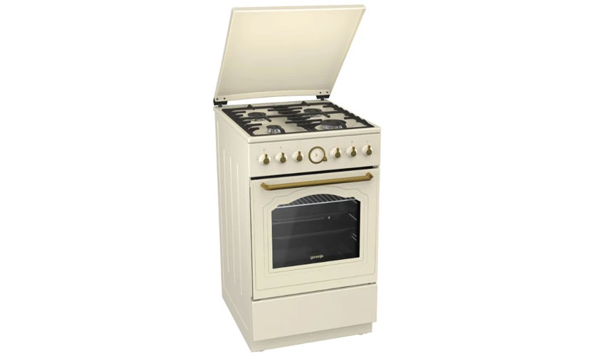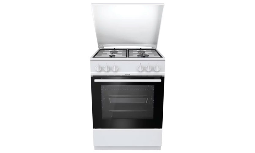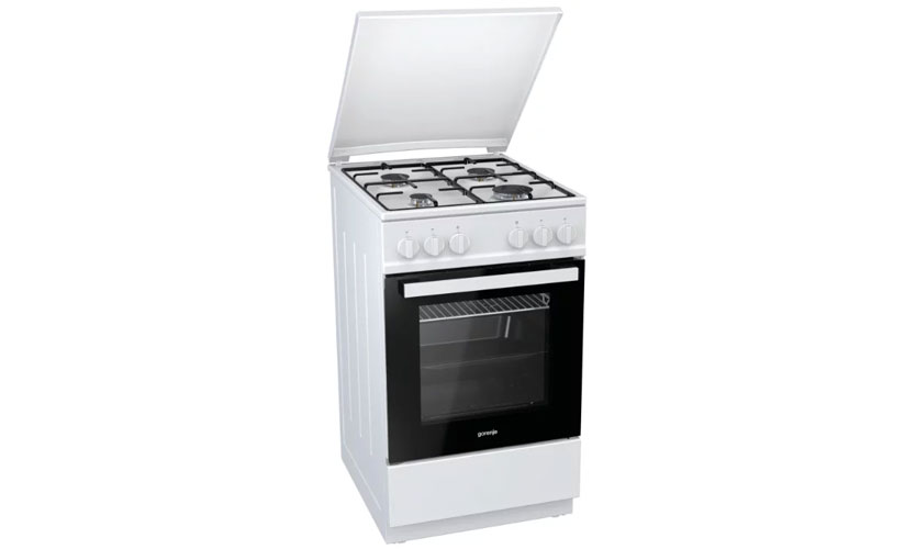 Cuisinière à gaz blanche mesurant 50x60x85 cm Le four d'une capacité de 71 litres est équipé d'une porte pliante à double vitrage (comme tous les modèles de la cote). A un rétroéclairage. La surface de travail est en émail. Dispose de 4 brûleurs, dont l'un est un chauffage rapide. Actionné par des commutateurs rotatifs. Il n'y a pas de verrou de sécurité. Dans la partie inférieure, il y a un compartiment de rangement pour la vaisselle, comme tous les poêles Gorenje. Le nettoyage est traditionnel, comme tous les modèles décrits ci-dessous.