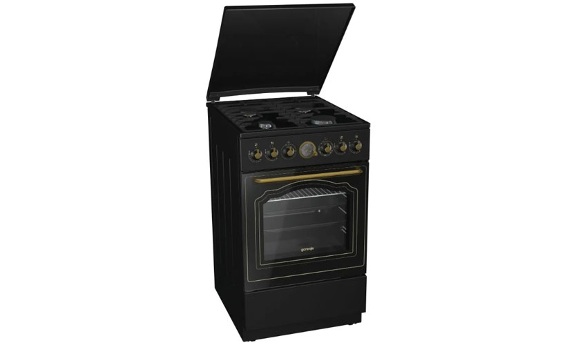 Poêle à gaz noir (50x60x85 cm) avec un revêtement en émail. Four pour 53 litres. Je suis entré dans la critique en raison de la présence d'un grill. Il y a 4 brûleurs, dont un chauffage accéléré, grilles en fonte. La mise en marche se fait avec des poignées. Il y a un allumage automatique des brûleurs et du four. Une coupure de gaz est prévue lorsque le feu est éteint pour les brûleurs. Il y a une minuterie sonore et une horloge. La température maximale de chauffage du four est de 280 degrés.