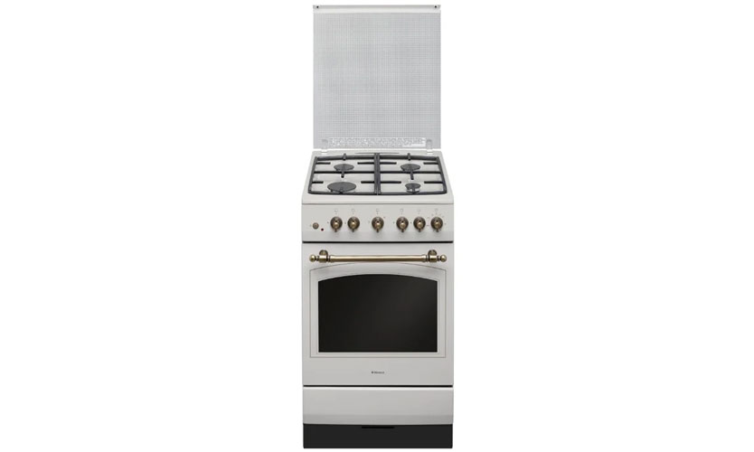 Alimenté par une conduite de gaz. Système de contrôle - mécanique, boutons rotatifs. Allumage électrique automatique pour four et plaque de cuisson. Porte battante. Il est complété par un gril électrique, un ensemble de broches. Le four est éclairé, il y a un système de contrôle du gaz.