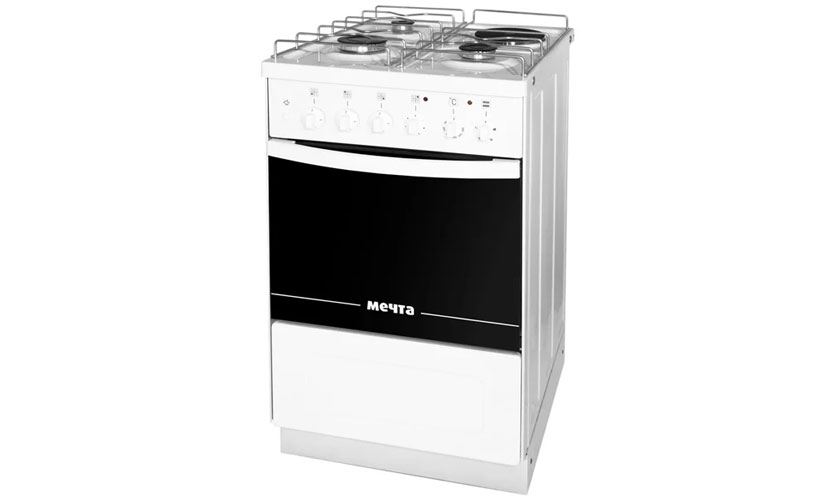 Complète le modèle TOP avec un coût de 10500 roubles. Plaque de cuisson combinée avec 1 brûleur électrique et 3 feux gaz. Volume du four 52 l. Revêtement - émail noir.