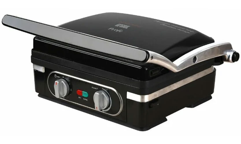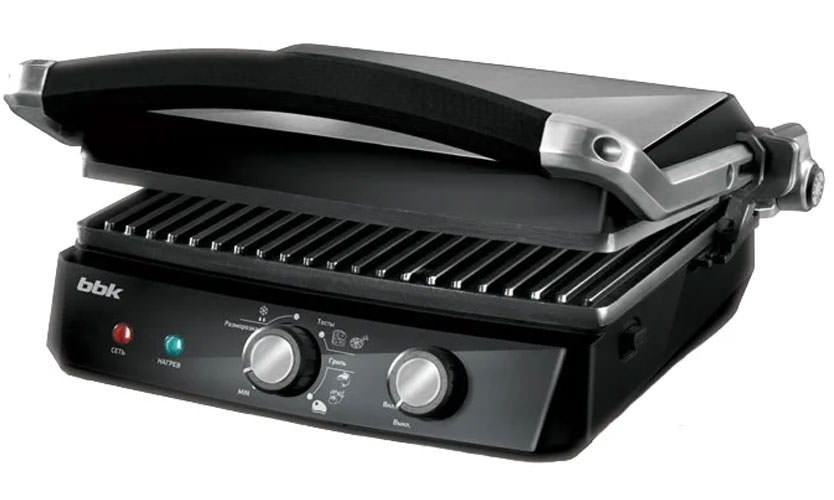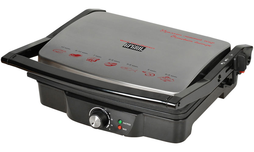 Prix - 11500 roubles. La partie supérieure du boîtier est très élégante, recouverte de verre et des invites sur les temps de cuisson de différents types d'aliments y sont appliquées. Le couvercle s'adapte automatiquement à l'épaisseur de la pièce. S'ouvre à 180 degrés, chaque moitié peut être utilisée pour le barbecue.