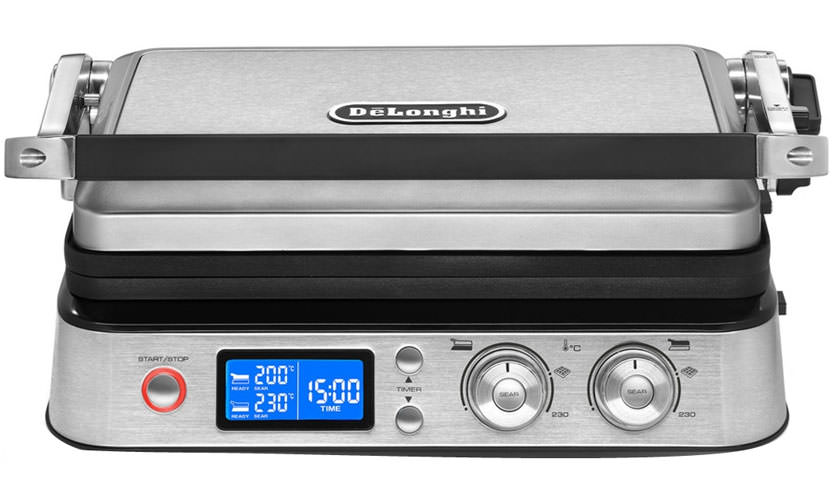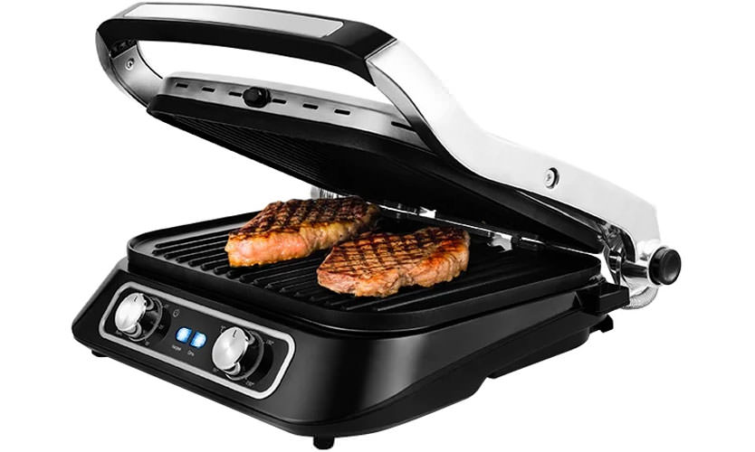 La cuisson s'effectue selon trois modes: comme un gril de contact, des hamburgers, des sandwichs, des toasts, du poulet et des légumes, comme un gril ouvert - la viande et le poisson, comme un four grill, cuire au four et faire frire le dessus. La fonctionnalité a une fonction spéciale Sear - elle scelle la viande à un stade précoce de la cuisson, de sorte qu'elle reste juteuse et molle à l'intérieur.