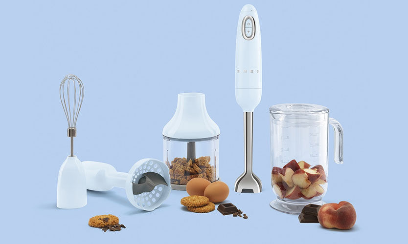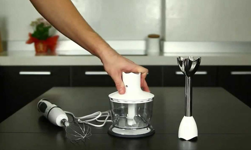 Se compose de deux parties: une poignée en plastique avec un moteur et des commandes à l'intérieur, des accessoires de broyage ou de fouettage qui sont attachés à cette poignée. Les accessoires comprennent: un fouet pour fouetter, une poignée d'immersion avec des couteaux pour broyer les aliments mous, un récipient à hacher spécial avec un couvercle et des couteaux à l'intérieur. Certains modèles ont une sélection étendue d'accessoires: pour couper des cubes, des tranches, etc.