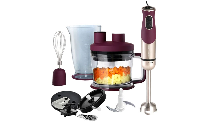L'ensemble comprend une râpe, un disque pour faire des tranches, un accessoire de cube, un hachoir de 1750 ml avec un trou pour ajouter le produit, un bécher doseur de 0,6 L, un fouet pour fouetter. Poignée submersible, métal.