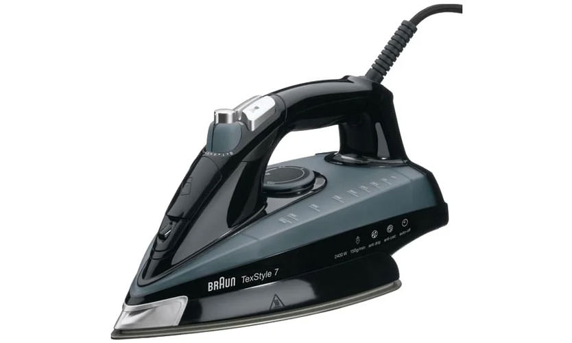 Fer puissant avec semelle en métal fritté résistant aux rayures. Par rapport au Braun TexStyle 7 TS745A, un jet de vapeur de 120 g / min et un débit de vapeur continu de 35 g / min sont inférieurs, tandis que le prix du fer lui-même est légèrement plus élevé. Il est équipé d'un support supplémentaire pour une plus grande stabilité en position verticale.