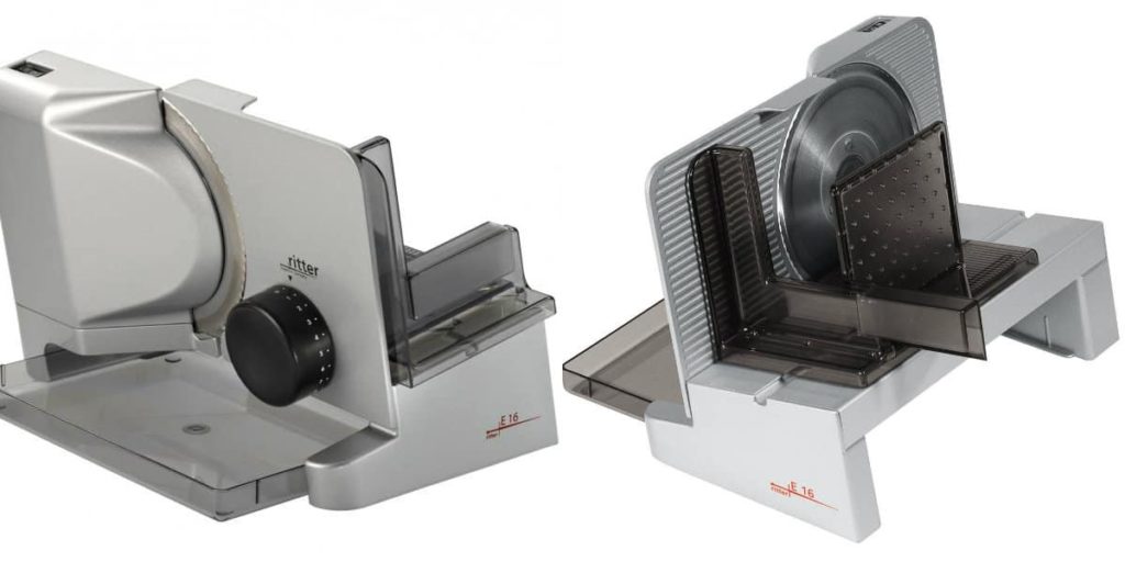 Modèle austère et métallique au design laconique. Puissance - 130 W, commutation entre impulsion et fonctionnement continu. Il y a un plateau pour trancher, un support pour les produits, un compartiment pour ranger le cordon. La trancheuse est en métal, tandis que le poids de l'appareil est d'environ 3 kg. Les propriétaires de la trancheuse Ritter notent le fonctionnement de haute qualité et sans faille de la trancheuse sur une longue durée de vie.