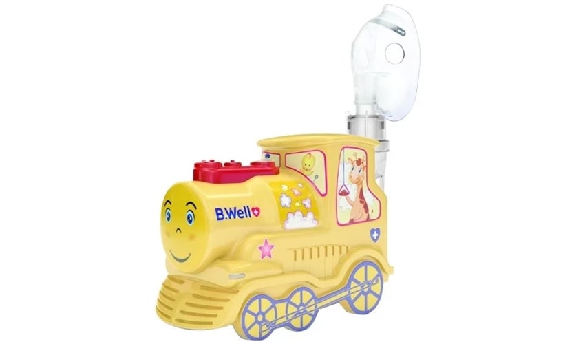 L'appareil avec des dimensions de 224x112x170 mm sous la forme d'un train jouet. La capacité contient 8 ml de médicament (le reste après la procédure est de 1 ml). Particules de l'ordre de 3,16 microns, réglables jusqu'à 5 microns. Pulvérise 0,4 ml en 60 secondes. En plus des buses indiquées pour le modèle précédent, il en fournit une de plus pour le nez, ainsi qu'un masque séparé pour les bébés. Des attaches pour la bouche et le nez sont disponibles. Embout buccal disponible. Un cas spécial est prévu pour le stockage et le transport. Equipé de filtres à air de rechange. Fonctionne à partir de 220 V. La durée du processus est de 30 minutes. Bruit 54 dB. Poids 1510 g. Prix: 2 383 roubles.