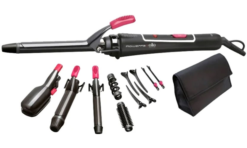 Ferme le classement avec un multistyler au design rose et noir. Puissance 46 W. Chauffe jusqu'à un maximum de 180 degrés. Indicateur enfichable et boucle de stockage sur crochet. Un fil avec un système de rotation à la base, 1,9 m de long. Il y a un étui rigide, des clips, des pinces de 16 et 32 mm, une buse de curling de 16 mm, une ondulation, une buse de redressage et pour les boucles en spirale.