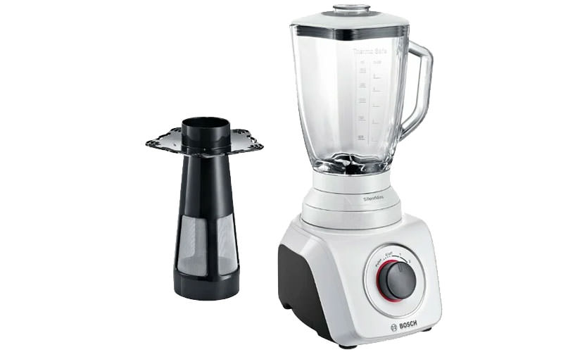 Mélangeur stationnaire en blanc. La puissance est de 700 W. 2 vitesses, mode impulsion. Le volume du bol principal est de 1,5 litre. Le matériau des couteaux est en acier inoxydable et le bol est en verre avec un fond épais. Passoire pour lait de soja ou smoothie sans pépins. Toutes les pièces amovibles vont au lave-vaisselle. Le système de verrouillage des lames les rend faciles à retirer pour le nettoyage. Toutes les pièces en plastique en contact avec les aliments sont sans danger pour la santé. Le bol résistant à la chaleur vous permet de préparer des plats froids et chauds. Prix - 5550 roubles.