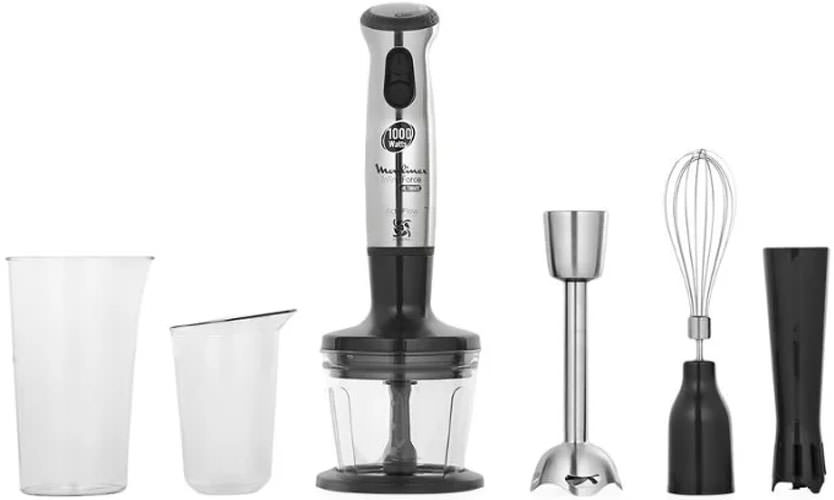 Le premier dans le TOP des modèles submersibles - Moulinex DD876D10 en acier inoxydable argenté. La puissance maximale est de 1000 W. 25 vitesses, turbo. Système à 4 lames Active Flow pour un hachage ou un mélange parfait. Alimentation secteur. L'ensemble comprend un mini hachoir, un fouet, un accessoire de mayonnaise, une cruche. La longueur du cordon d'alimentation est de 1,8 m.