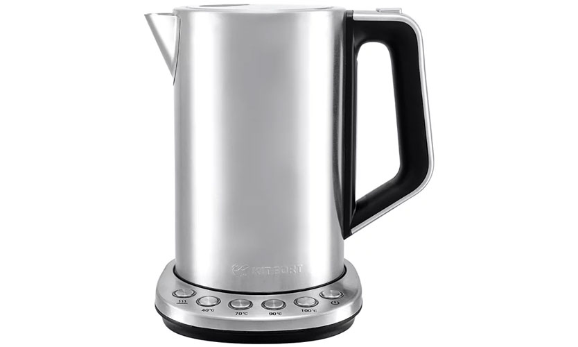 Bouilloire électrique d'une capacité de 1,7 litre. Fabriqué en métal de couleur foncée. La température peut être sélectionnée parmi 5 modes dans la plage de 75 à 100 °. Les boutons sont situés sur le panneau d'accueil. En l'absence d'eau, il ne s'allume pas. L'indicateur indique la quantité d'eau versée. Lorsqu'il est retiré de la base, il s'éteint automatiquement. Maintient la température sélectionnée pendant 20 minutes. Poids - 1,6 kg. Puissance - 2000 W. Il y a un compartiment pour le cordon d'alimentation. Prix - 7300 roubles.