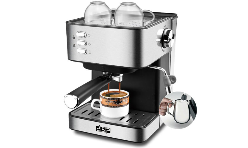 Une machine à café (21,5x25x28,8 cm) couleur argent pour deux tasses. Il y a une grille amovible au-dessus du bac collecteur. Le réservoir d'eau de 1,5 l a un design transparent. Peut fouetter la mousse de lait (robinet séparé). Le panneau supérieur chauffe, vous pouvez y mettre des tasses pour le chauffage. Il a des trous pour l'évacuation des condensats. Le contrôle est effectué avec des boutons et un régulateur (niveau de vapeur). Livré avec deux cuillères doseuses et un verre à lait. Pression 20 bar. Puissance 850 W. Prix: 8 708 roubles.
