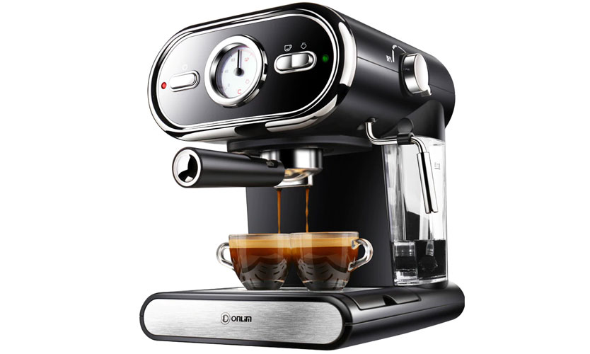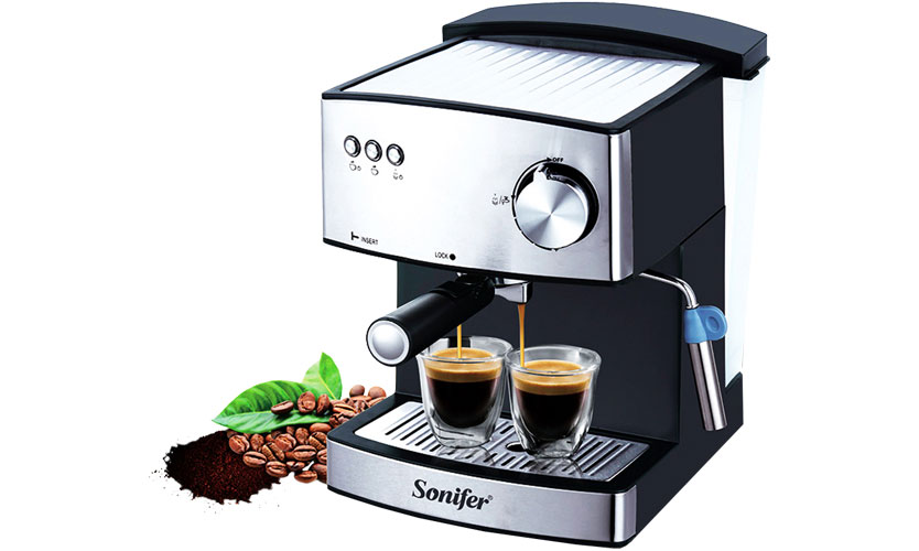 Machine à café électrique (23x25x29 cm) en aluminium dans les couleurs noir et argent. Conçu pour deux tasses. Bac d'égouttement pour recueillir les gouttes. Il y a une zone chaude sur le dessus où vous pouvez mettre des tasses pour vous réchauffer. Réservoir d'eau transparent 1,2 l. Le contrôle est effectué par des boutons sur le corps. Le niveau de vapeur est régulé par un interrupteur rotatif. Permet de fouetter la mousse de lait (bec séparé). Livré avec une cuillère doseuse. Poids 3,21 kg. Cordon 0,8 m. Pression 15 bar. Puissance 850 W. Prix: à partir de 6 883 roubles.