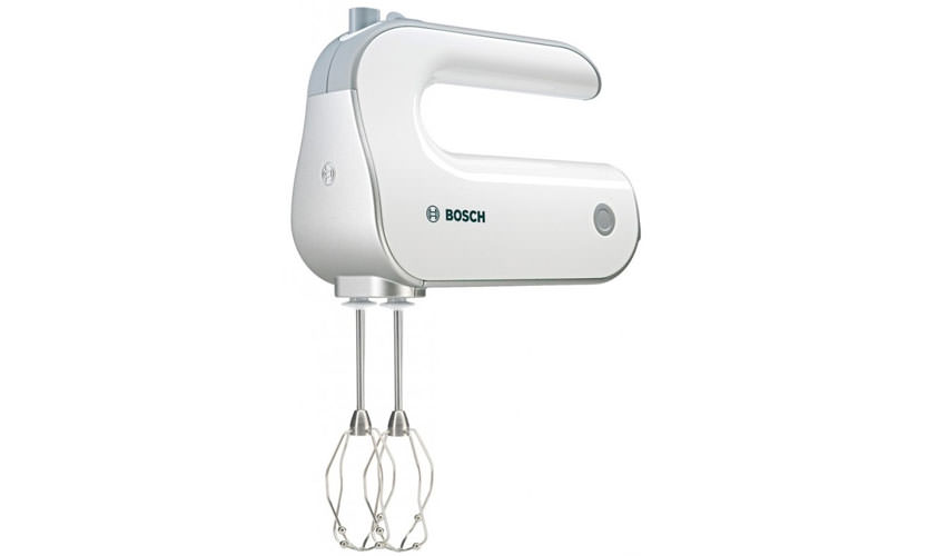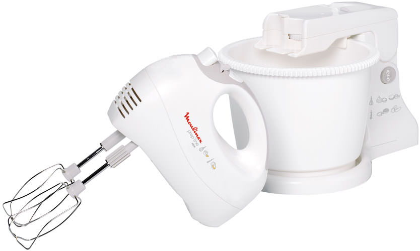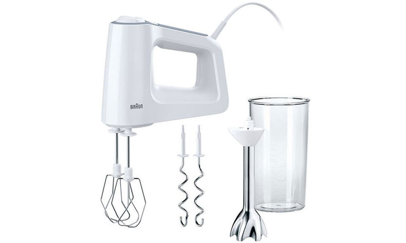 Le batteur à main est en plastique. Équipé de trois types d'accessoires - 2 pour faire de la pâte, 2 pour fouetter et un mélangeur. Fonctionne à cinq vitesses. Dispose d'un mode turbo. Les pièces jointes sont détachées en appuyant sur un bouton. Puissance - 500 W. L'ensemble comprend une tasse à mesurer (à utiliser comme mixeur).