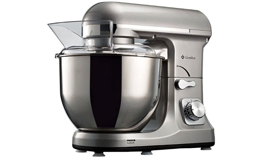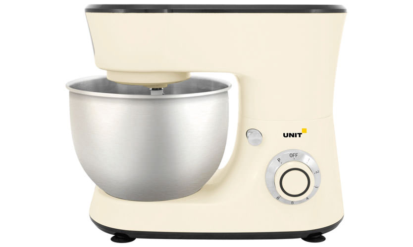 Mélangeur planétaire avec un corps en plastique et un bol en acier inoxydable d'une capacité de 5 litres. A 2 attachements de pâte et un fouet pour battre. Fonctionne à 6 vitesses, dont le régulateur est situé sur le corps. Il existe un mode impulsion. Puissance - 1000 W. Complet avec couvercle de tasse.