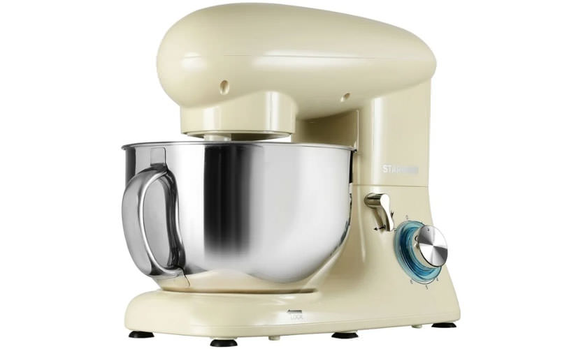 Instrument fixe et stable en plastique bleu, turquoise ou laiteux.Un bol avec une poignée de 5,5 litres est en acier inoxydable. Fonctionne à six vitesses. Mode pulsé. L'ensemble comprend des crochets pour pétrir la pâte et des batteurs. Puissance - 1600 W. Le bol est fermé avec un couvercle.