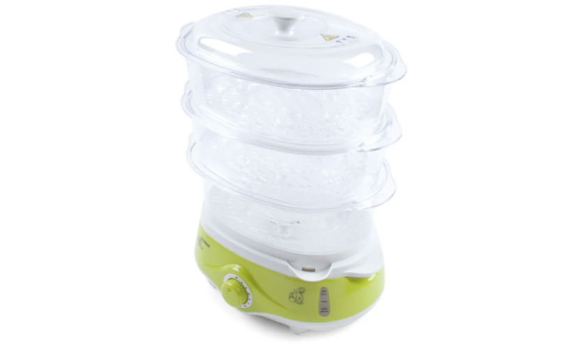 Prix - 2900 roubles. Haute puissance - 1000 W. Minuterie pendant 1 heure avec mise hors tension automatique. Protection contre la surchauffe à double niveau. La structure a trois niveaux à la fois. Associé à la puissance élevée, cela accélère la cuisson et vous permet de préparer le dîner pour la famille en une seule fois. Le volume total des plateaux est de 11 litres, chacun est équipé de poignées confortables. S'éteint automatiquement lorsqu'il n'y a pas d'eau, le niveau de liquide est indiqué par l'indicateur.Il est permis d'ajouter de l'eau à une unité en marche.