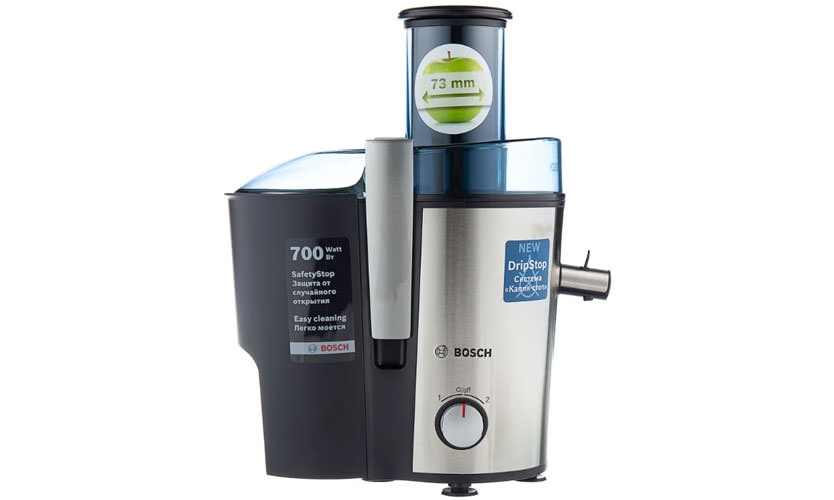 La conception et le volume des conteneurs sont similaires à Bosch MES3500, mais plus puissants (900 W). Le corps est composé d'une combinaison de plastique et d'acier inoxydable. Le compartiment de chargement a presque la même taille (75 mm). Fonctionne à deux vitesses. Pour obtenir du jus de pomme avec un minimum de mousse, mieux vaut utiliser le second.