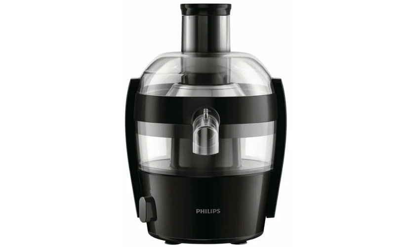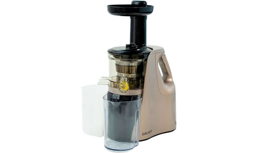 Le prix moyen est de 3500 roubles. Conception de cas en jaune ou noir au choix. Verticale. Il n'y a qu'une seule tarière. Puissance de travail - 200 watts. Livré avec un verre à jus de 600 ml. Fournit un approvisionnement direct en jus et un système anti-goutte. La pulpe est éjectée automatiquement, le volume du réservoir de collecte est de 600 ml.