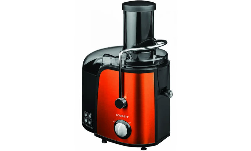 Prix - 3700 roubles. Le corps est orange. Puissance de travail - 1000 W. Pour le jus, un verre d'un volume de 1 litre est fourni, il y est introduit directement, un système anti-goutte. La pulpe est jetée en mode automatique dans un récipient de 1,5 litre. Un séparateur est prévu pour éliminer la mousse. Protégé contre les démarrages accidentels.