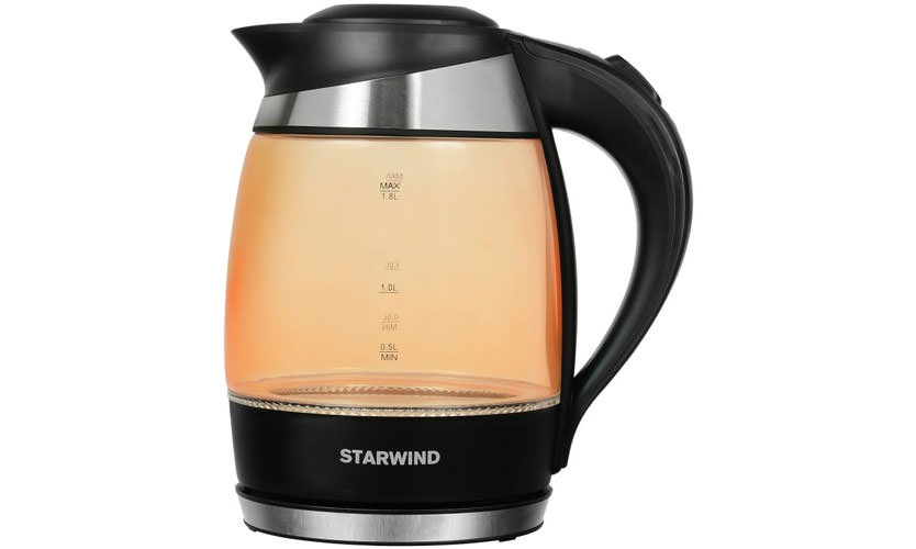 STARWIND est une marque russe avec une production en Chine. Il y a moins d'un an, il a offert au consommateur une théière en verre avec un éclairage de différentes couleurs de carrosserie. Il y en a 8. SKG2212 - orange. La partie inférieure du corps, la poignée et le couvercle sont en plastique. Le volume de 1,8 litre est plus que suffisant pour une famille de 3-4 personnes. Il existe des indicateurs d'inclusion et de niveau d'eau. Le bec de la bouilloire est équipé d'un filtre pour le nettoyer, ce qui est un gros plus pour un modèle bon marché. Prix - 1000 roubles.