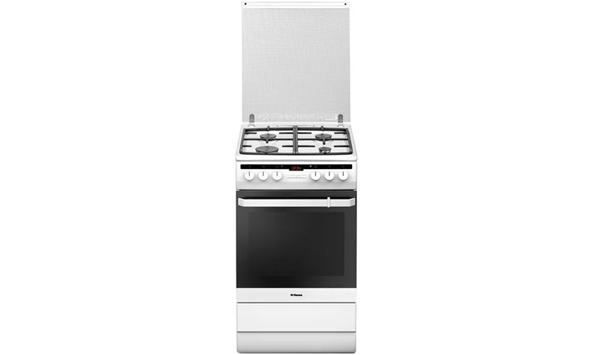 Le poêle en blanc, comme la plupart des modèles de test, mesure 50x60x85 cm. Four pour 54 litres avec grill (équipé d'une broche). Il y a un contre-jour. Le plan de travail émaillé est équipé de quatre brûleurs à gaz, dont l'un est conçu pour un chauffage rapide. Allumage électrique. Les boutons rotatifs sont utilisés pour changer. Les brûleurs sont protégés contre un fonctionnement sans feu. Équipé d'une minuterie avec un signal sonore. Prix: 11370 roubles.