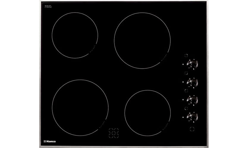 Plaque de cuisson radiante de la série 300, puissante - 7,1 kW. Avec un excellent ensemble de brûleurs pour n'importe quelle forme du fond de la vaisselle, contrôle à glissière. Avec un cadre en métal autour du bord, comme dans Hansa BHCI65123030. Prix - 20490 roubles.