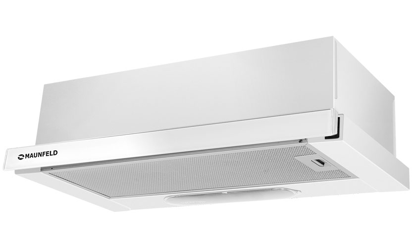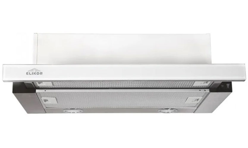 Hotte blanche de 28 cm de profondeur.Les deux vitesses de rétraction sont commutées avec des boutons. La productivité est de 570 mètres cubes / h. L'éclairage est assuré par une lampe LED de 2,5 W. Puissance 103 W (moteur 100 W). Bruit 48 dB. Poids 6 kg. Prix: 4060 roubles.