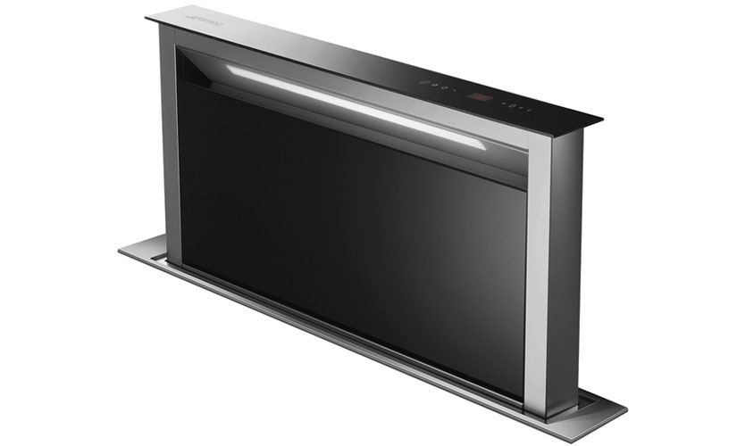 Hotte encastrable de 12 cm de large, noir élégant. L'aspiration se produit autour du périmètre pour couvrir une plus grande surface. Sortie d'air 150 mm. Fonctionne à 4 niveaux de vitesse. Fournit un mode intensif et intervalle. Dans le second cas, il s'allume une fois par heure, fonctionne pendant un certain temps et s'éteint. Commuté par des boutons tactiles. La productivité est de 700 mètres cubes. m / h. Fournit une indication de la contamination du filtre. Dispose d'un tableau de bord électronique et d'une minuterie. Illuminé par une lampe à diode de 7 W. Puissance 277 W (moteur 270 W). Prix: 131 990 roubles.
