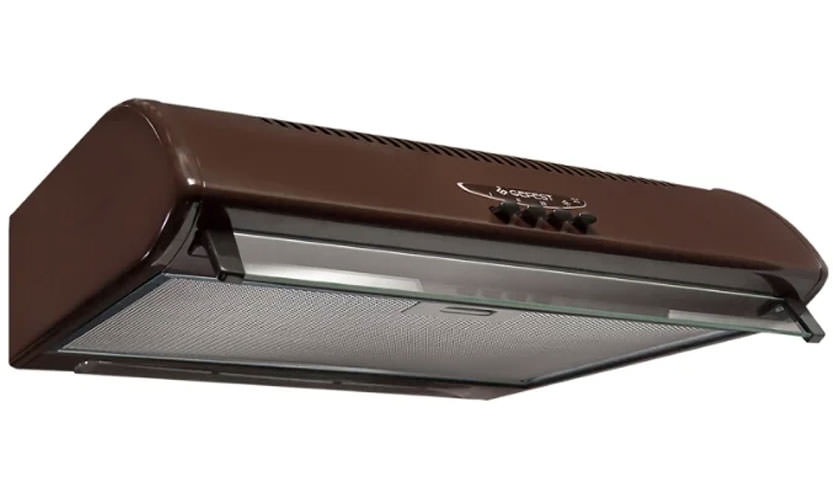 Le modèle de la société GEFEST avec un beau design, contrairement à ELIKOR Davoline 50, est réalisé en marron. La hotte a une commande par bouton-poussoir: vous pouvez sélectionner l'une des trois vitesses de fonctionnement. Le niveau sonore minimum est de 38 dB, le maximum est de 62 dB. Performances maximales en mode de rétraction - jusqu'à 300 m3/ h, et en mode recirculation - jusqu'à 150 m3/ h Le corps dispose de 2 lampes à incandescence d'une puissance de 25 watts. Le filtre en aluminium est facile à retirer, facile à nettoyer, il n'y a pas de filtre à charbon, mais il peut être installé.