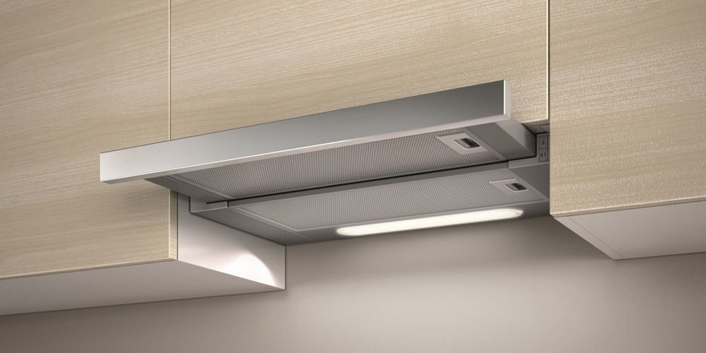 - embarqué - le plus compact, le plus puissant et le moins visible. Ils sont montés directement dans une armoire murale ou un dôme de cheminée décoratif, ou dans une table de travail à côté de la plaque de cuisson. Équipé d'un panneau inférieur fixe ou coulissant. Le premier - augmente considérablement la zone d'admission d'air et facilite le contrôle;