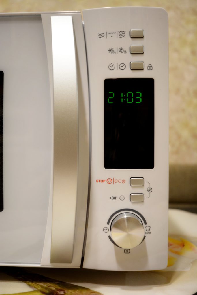 Le four affiche une consommation électrique de 1250 watts pendant le fonctionnement, ce qui est suffisamment bas pour un micro-ondes. Le système de contrôle est une combinaison d'électronique et de mécanique, ce qui facilite de nombreux points de configuration et d'utilisation. Les modes de cuisson suivants sont inclus dans le programme: