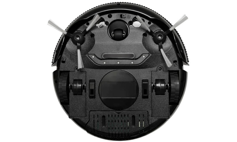En bas, il y a deux roues en caoutchouc pour le mouvement et un guide pour la manœuvre. Il y a aussi un compartiment pour le compartiment à piles et des brosses latérales pour nettoyer la surface. Des capteurs sont situés le long du périmètre de la structure pour orienter l'aspirateur dans l'espace.