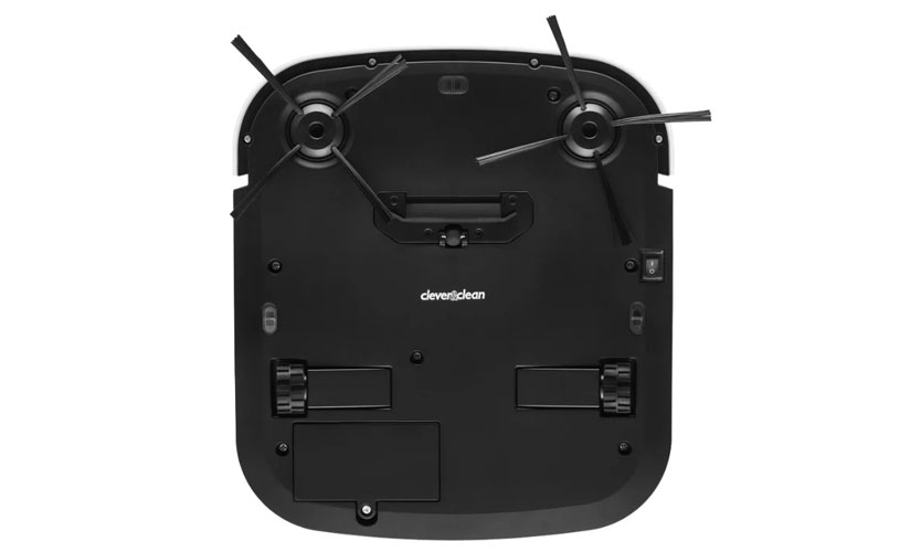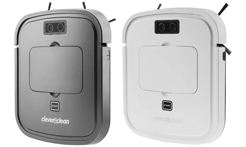 Le robot Clever & Clean a la forme d'un rectangle plat avec des bords arrondis, mesurant 25,6x22,8 cm, une faible hauteur, seulement 3,2 cm et un poids de 0,825 kg. Le corps est en plastique. La face avant est dans une combinaison de gris foncé et de blanc, et le dos est noir.