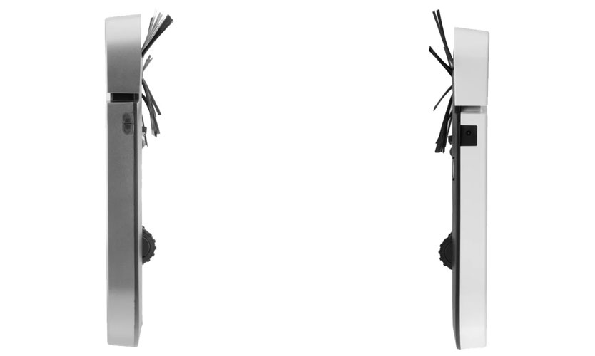 Sur le panneau supérieur de l'appareil, il y a un bouton d'alimentation éclairé par deux LED. Il y a aussi un couvercle pour le compartiment à poussière et un capteur qui envoie et reçoit des signaux ultrasoniques. La surface latérale est équipée d'un pare-chocs avant souple. Sur le côté opposé, il y a une sortie avec une grille, puis un capteur infrarouge est monté qui réagit aux obstacles. C'est également là que vous branchez l'adaptateur secteur. En bas sont visibles: