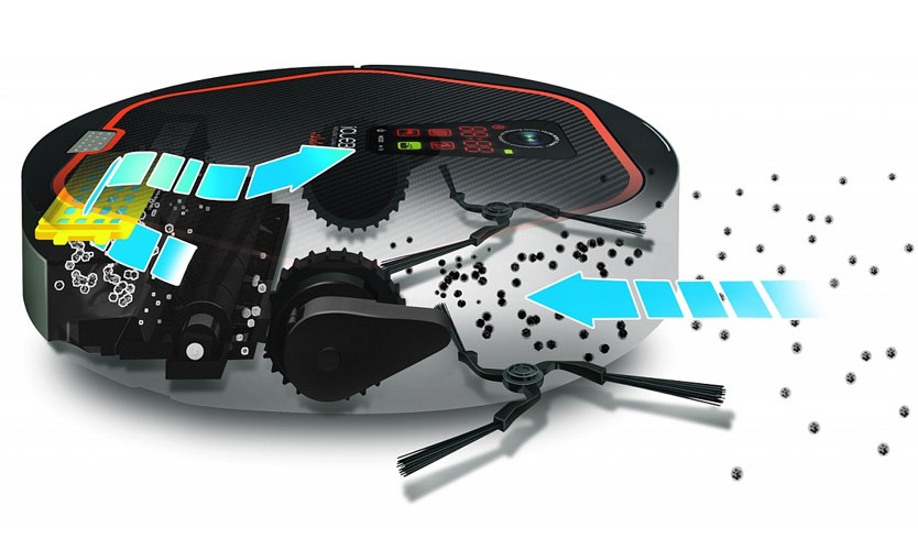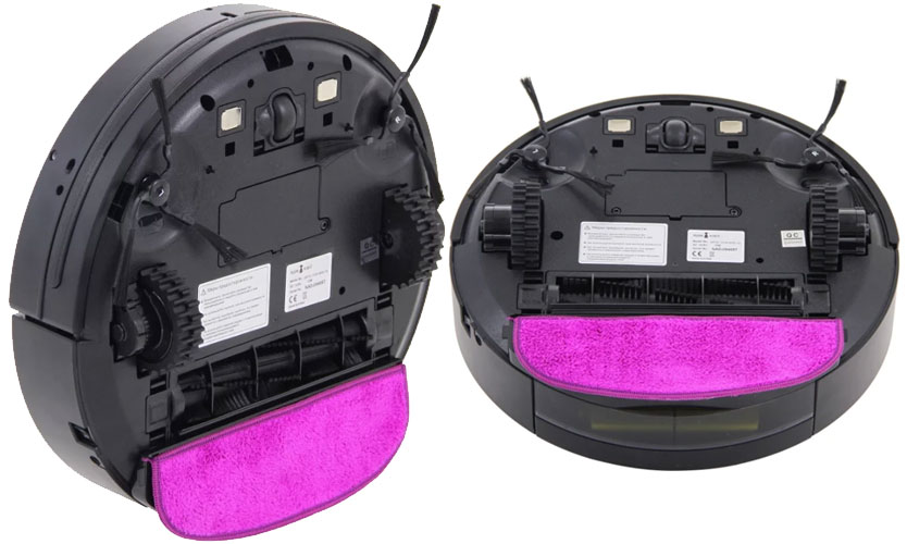 Pendant le processus de nettoyage, les deux brosses avant fonctionnent, elles ramassent les débris vers le centre, où un grattoir en caoutchouc fixe les dirige dans le bac à poussière à travers l'orifice d'aspiration. Pour le nettoyage humide, un chiffon en microfibre humidifié est attaché à une barre spéciale derrière la brosse principale. Le mode de nettoyage humide s'active automatiquement après l'installation de la barre. Dans le même temps, il est impossible d'utiliser le robot dans des pièces humides, ainsi que son fonctionnement pour collecter l'eau.