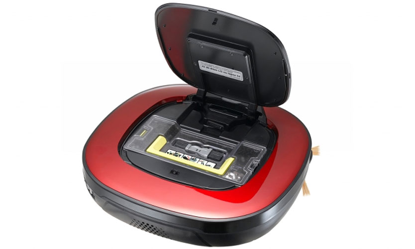 L'aspirateur LG VRF6043LR a une forme carrée profilée. Se distingue par ses dimensions compactes 34x34x8,9 cm et son faible poids (3 kg). Le corps est fait de plastique robuste en noir et rouge. Le dessus de l'appareil est un couvercle de bac à poussière. Pour l'ouvrir, il suffit de cliquer dessus. Au centre se trouvent les boutons de commande: démarrage / arrêt, mode turbo, retour à la station.