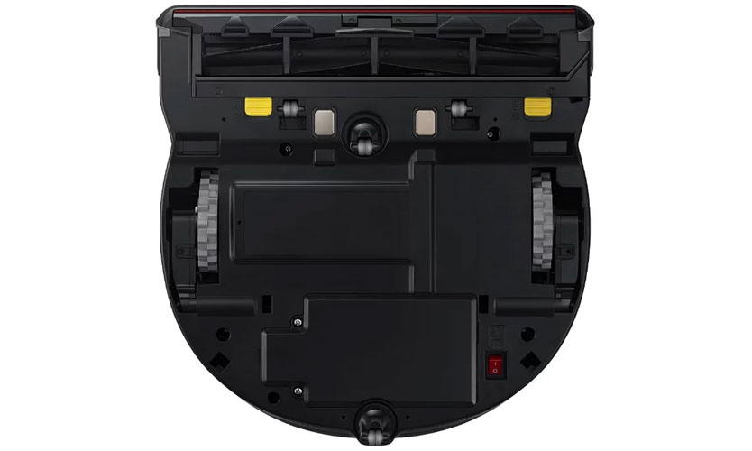 En bas, il y a des roues de guidage, un couvercle sur la batterie et des contacts pour se connecter à une station de charge. Sur le côté, il y a des capteurs mécaniques et infrarouges pour détecter les obstacles.