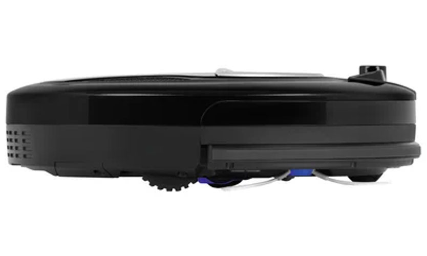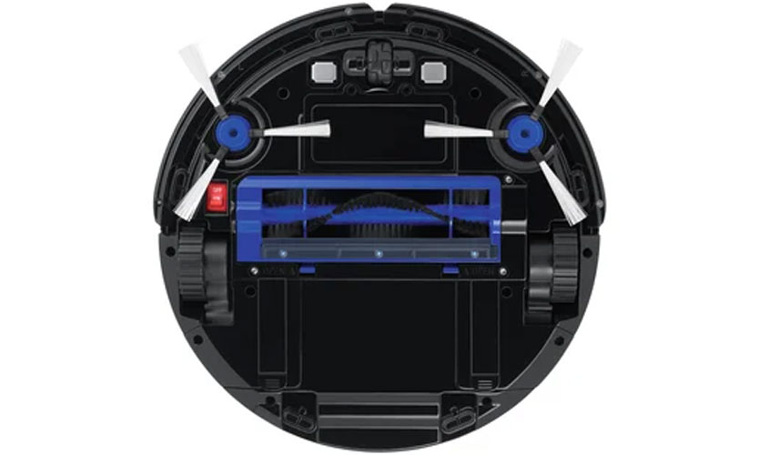 En bas, il y a 2 roues motrices sur les côtés, 1 pivot à l'avant, une brosse turbo au centre, 2 brosses latérales, ainsi qu'un compartiment batterie et des contacts de charge. Dans la même partie de l'aspirateur, il y a un bouton marche / arrêt pour l'appareil.