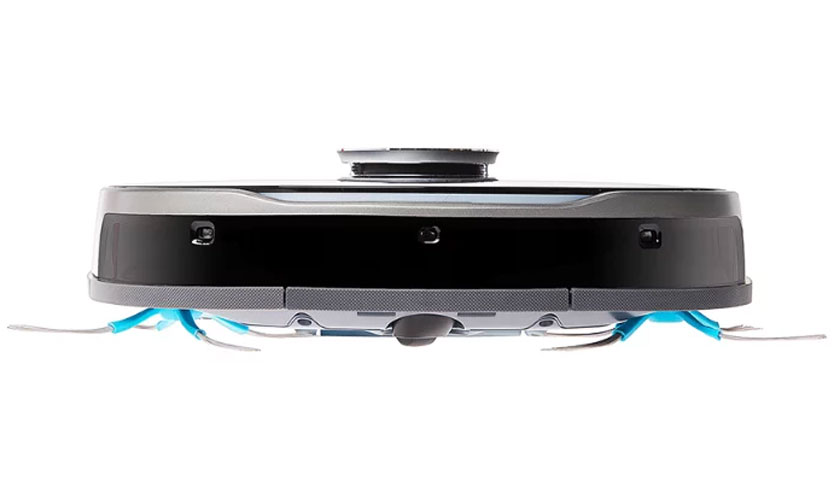 Tournons le gadget et regardons ce qu'il y a en bas. Il existe deux brosses latérales qui fonctionnent indépendamment l'une de l'autre. Bouton marche / arrêt, roues motrices, auxiliaires et pivotantes. Capteur de hauteur intégré pour empêcher l'appareil de tomber des marches ou des seuils élevés.
