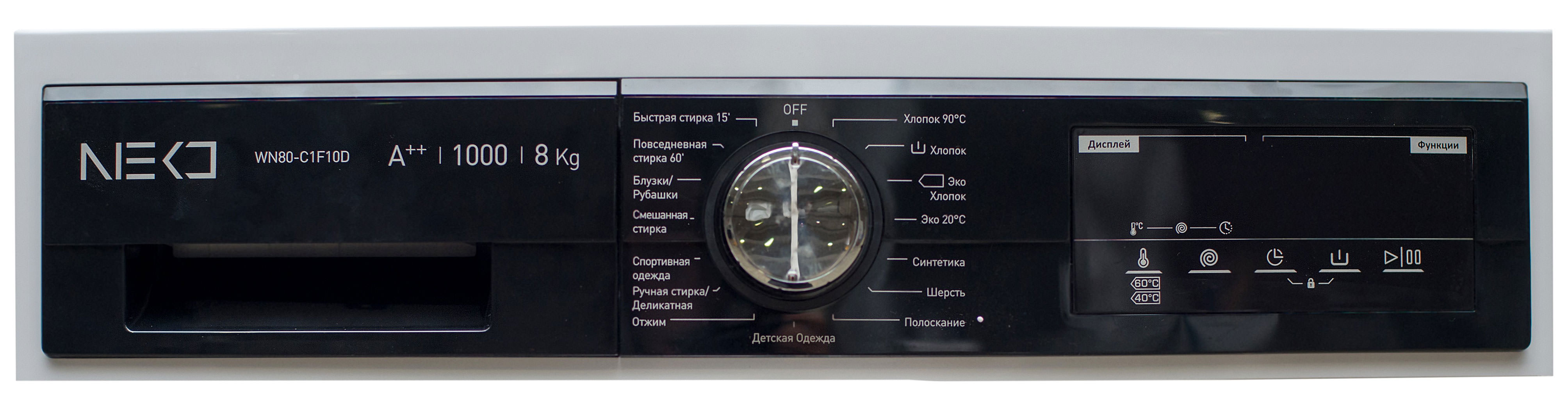 NEKO WN80-C1F10D est fabriqué dans une couleur blanche classique. Le panneau de commande avec affichage LED dans la partie supérieure est surligné en noir -semble très riche... Dimensions - 84,5 × 59,7 × 55,7 cm, poids - 72 kg. Figurines idéales pour une machine avec une charge de 8 kg.