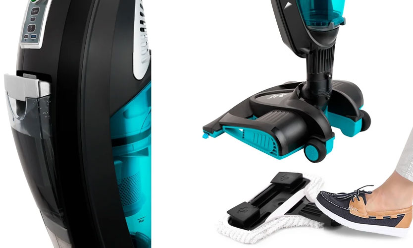 Aspirateur au design moderne, de couleur argent avec inserts turquoise: poubelle, boutons, fond de brosse. Vous pouvez utiliser l'aspirateur avec ou sans la poignée d'extension fixée. Une fois installé, la hauteur de l'aspirateur passe de 84 à 120 cm, ce qui est plus ergonomique compte tenu de la taille de la personne. De plus, c'est dessus que se trouve le bouton d'alimentation en vapeur.