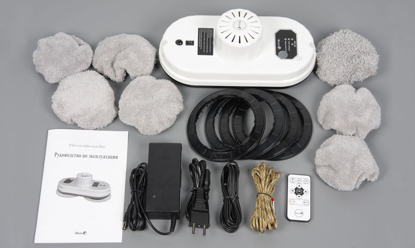 La télécommande est petite, plate, les boutons sont petits, à membrane. Lingettes de nettoyage rondes en microfibre synthétique éponge avec poils moyens des deux côtés Des cordons en caoutchouc sont cousus dans les bords pour attacher une serviette tendue sur un anneau en plastique. Ces anneaux sont montés sur roues en bas.