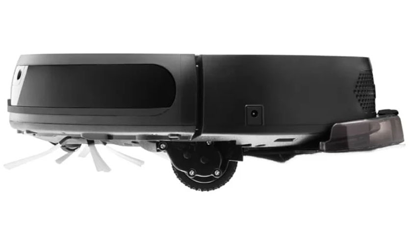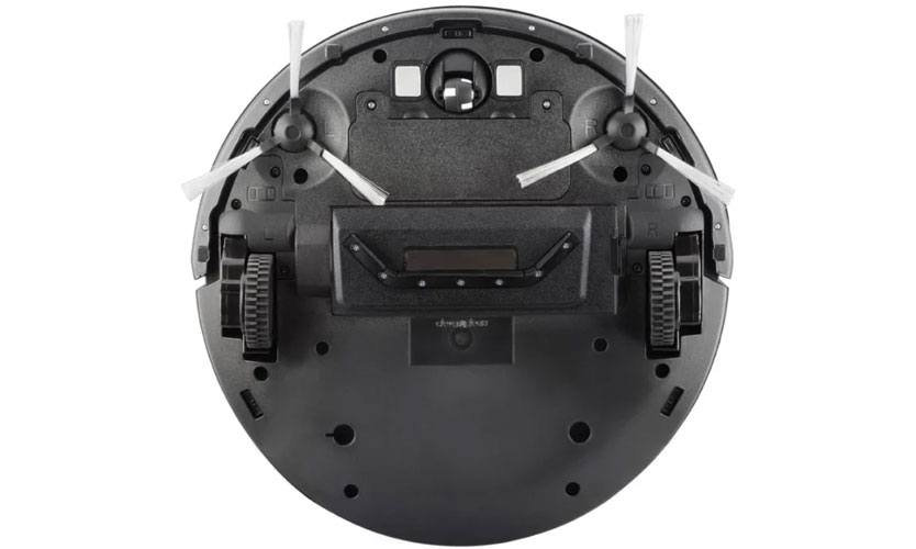 Bas. Une paire de brosses latérales amovibles, un rouleau pivotant, une brosse centrale à pétales hérissés, une zone de contact pour la recharge à la base, des roues de grand diamètre pour le cross-country, un tampon pour essuyer les lingettes. Trou d'aspiration des débris au centre. La suspension est conçue pour surmonter des hauteurs de 15 mm, la microfibre est fermement pressée contre la surface en fonctionnement.